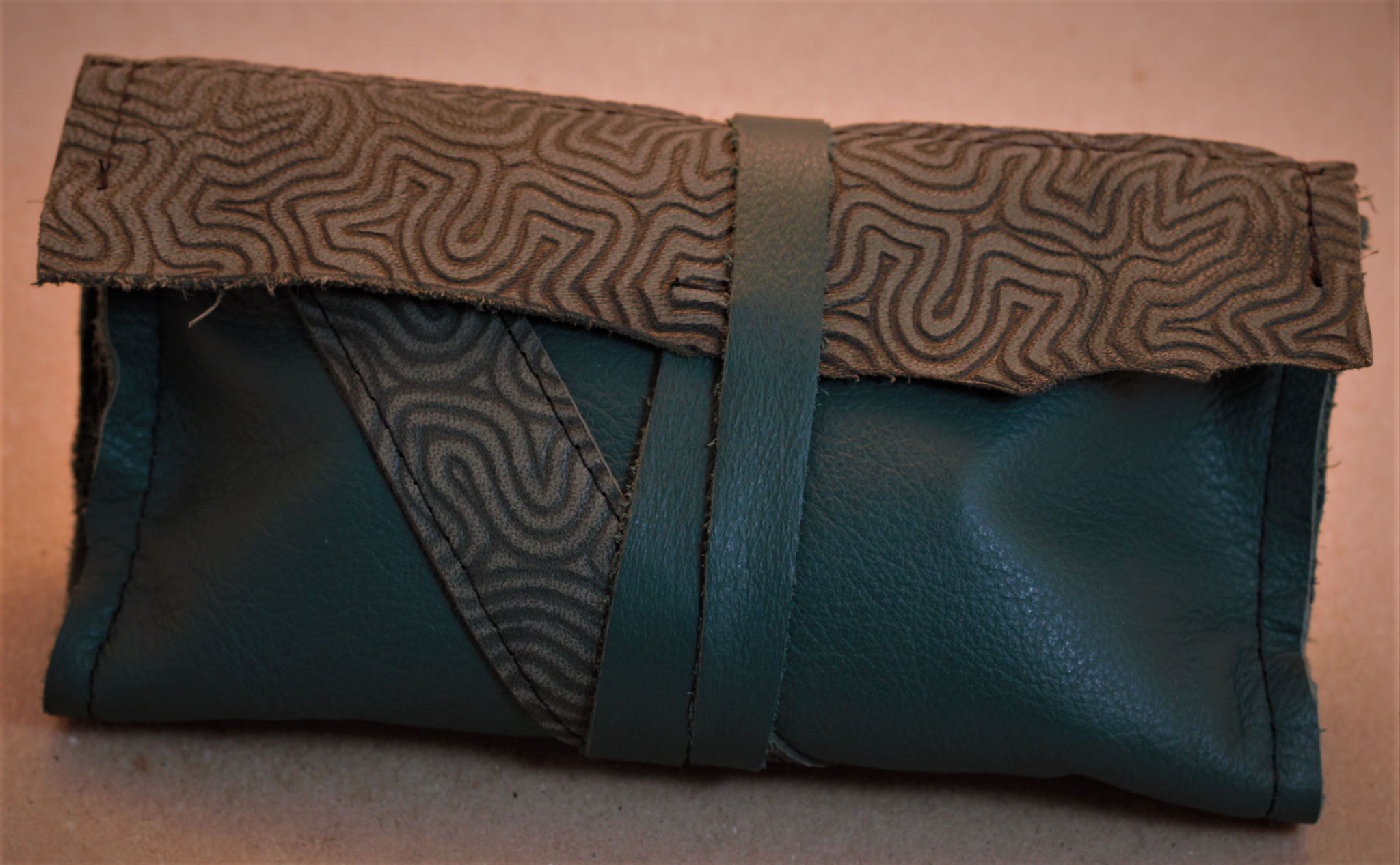Tabakbeutel (für alle gängigen Größen) aus grünem Leder mit Applikation aus geprägtem hell-grünem Leder.
